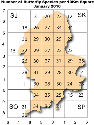 No matter where you record, the chances are that you will either add new species to the 10km square list or update existing records. The map opposite shows the number of species of butterflies and moths recorded in each 10km square.